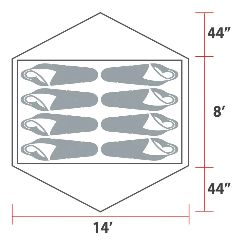 - Tent dimensions: 14′ x 8′ x 6’6″ (4.3 x 2.4 x 1.9 m)